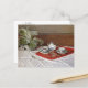 A fine art postcard with the impressionist painting, The Tea Set (1872), by Claude Monet (1840-1926). A still life with a porcelain tea set in a blue and white pattern on a white linen tablecloth next to a potted plant.