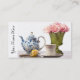Tea Time still life fine art photograph by Terry McClary featuring a blue and white tea pot, a green glass vase filled with pink rose, a vintage tea cup, a spiral sliced lemon, and a vintage silver butter knife on a reflective marble table top with a bright white background.