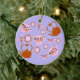 Tea Time Ornament by Kristie Hubler, with a china tea pattern teapot, teacup, plate, with fruit and leaves pattern, plus a copper teakettle. China pattern has berries, a peach, and an apple slice with undulating leaves.