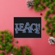 Slogan graphic postcard reads Teach peace with a single white dove in the centre of the design which is the symbol of peace and harmony. Background colour and dove n silver foil or if required can be changed to gold or rose gold. Art and design by Sarah Trett for www.mylittleeden.com