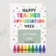 Teacher Appreciation Gift Card Holder featuring multicoloured crayons, ideal for sending for Teacher Appreciation Week. This item is also available as a digital download, so you can print at home instead