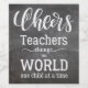 Teacher appreciation gift with white typography script "teachers change the world one child at a time" inspirational quote and cheers on blackboard background.