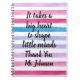 "It takes a big heart to shape little minds" personalised notebook for Teacher Appreciation. Combining colourful watercolor stripes with an inspirational quote in script typography, this notebook can be customised to add your favourite teacher's name. Great as a gift to a Teacher, Teacher's Assistant, Coach, Special Education Teacher for Back to School, Holidays or as an end of the year Thank You gift. ©TeacherTribeMerch