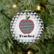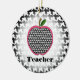 A Christmas ornament for teachers featuring a background of houndstooth. Matching apple at centre outined in pink. Text under apple says "Teacher."