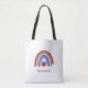 A cute teacher bag featuring a colourful rainbow accented with a red pencil and an apple on a white background. Personalise with the teacher's name.
