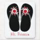 A mousepad for teachers featuring an illustration of a pair of black flip flops with red and white pom poms covered by a button with an illustration of a red apple. Personalise with your name in red at bottom.