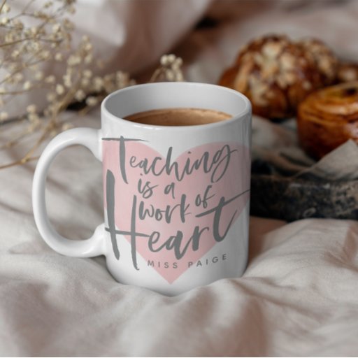 Teaching its a work of heart personalised teacher gift. With hand lettered script, a pink watercolor and heart, floral design and and space for their name. The perfect end of year or holiday gift for your favourite teacher.