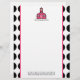 Letterhead for teachers featuring a polka dot print design on each side outlined in pink. Pink Schoolhouse at top centre. Personalise with your name (top) and information (bottom.)