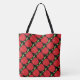 This canvas tote bag features a teacher theme with a red apple pattern as the background and a black circle offering customisable text for the teachers name.