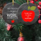 Typography script tree ornament for teachers with an inspirational quote: "Teachers change the world one child at a time", with a symbolic red apple and your custom text on the backside. +++++++++++ Personalise it with your teacher's name! ++++++++ It can be a pretty Christmas gift for a teacher.