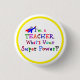 Teacher superhero colourful custom-designed button with yellow circle trim.