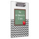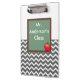 Keep organised in style with a Personalised Teachers Grey Chevron Chalkboard custom clipboard which features a Grey Chevron Chalkboard pattern with a chalkboard and apple. The Chalkboard currently says Mr. Anderson's Class. Personalise with your name or any text you'd like. If you need help customising this product, please contact me through my store and I'll be happy to help! Many matching products are also available in our shop. Printed on two sides. Holds up to ½” paper securely.