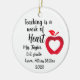 Recognise your child's teacher this Holiday season with this cute and charming teacher keepsake. This ornament states, "Teaching is a work of Heart" and features a cute apple image in red. The lettering is in black on a white background and can be personalised with your teacher's name, grade teaching, student's name and year. Your child's teacher is a huge influence on them, and he/she will be proud to deliver this gift this holiday season.