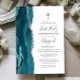 The left-hand edge of this elegant modern first communion invitation features a teal blue watercolor agate border trimmed with faux silver glitter. A faux silver foil cross appears above the customizable text, which combines handwriting, copperplate and italic fonts in charcoal gray on a white background. The reverse side features a matching teal blue and silver agate design.