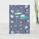 Teal and blue ink pen drawing of a variety of ocean sea creatures (including fish, whale, jellyfish, and puffer fish), printed on a blank greeting card.