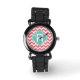 Change the initial to any text you like, and make this wristwatch a very personal gift. Background features coral coloured zigzag chevron stripes, and the centre is light turquoise or teal. White detailing. From Scarebaby Design, backed by the Zazzle guarantee.