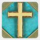 Gold and teal cross on diamond shaped background.