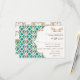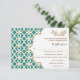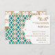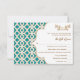 Elegant, stylish and beautiful french Moroccan tile inspired wedding response cards with a repeating teal blue green hue and gold geometric pattern design and gold hued floral flourishes. This upscale and luxe RSVP card is perfect for a Moroccan, Arabian Nights or Aladdin themed wedding. The back of these custom, fancy frame cards can be personalised with the names of the bride and groom on the printed ribbon look design. Artwork and design © Chrissy H. Studios, LLC. All Rights Reserved.