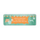 Holiday return address labels with a teal blue and white polka dotted background, a set of orange and melon lights, snowflakes, a deer silhouette, old fashioned toy, and an orange frame where you can easily add your name and address to customise.