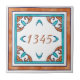 A hand drawn teal and orange frame around a orange house number with dark blue outlines and a floral pattern in the corners.