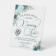 This fun pedestal sign will invite your guests to take a pair of complimentary flip flops so they can dance the night away at your wedding reception. The beautiful design includes hand painted watercolor roses in shades of teal, turquoise, and aqua, along with eucalyptus leaves and garden greenery. The sign reads: A little treat for your Dancing Feet. If your feet are tired and sore, slip these on and dance some more! Compliments of the new Mr. & Mrs..." There is a cute clip art graphic of a pair of flip flops or sandals, and space for your names. Wonderful way to add fun and comfort to the celebration of your special day!