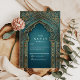 An opulent Islamic wedding design featuring a teal and gold arched frame inspired by mosque architecture and Persian artistry. With intricate floral motifs and geometric symmetry, this invitation exudes elegance, spirituality, and timeless cultural refinement — ideal for a luxurious Islamic wedding.