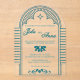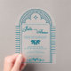 Elegant transparent acrylic wedding invitation with teal lettering and art deco design. Perfect for modern couples seeking luxury, timeless style, and a unique keepsake. Ideal for chic, contemporary weddings.