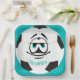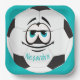 Personalised Soccer Ball Funny Face Party Tableware Set: Paper Plates teal black and white soccer ball funny face.
