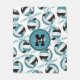 This cool volleyball themed fleece blanket features a mirrored pattern of volleyballs with teal, black and white panels and the sporty font text "I love volleyball" in teal that stretches between the angled rows of volleyballs - athlete name and monogram can be personalised on the large overlying circle pendant - background is customisable white - easily delete the "I love volleyball" text lines, if desired, or replace the monogram with the player's varsity letter or jersey number - by katz_d_zynes