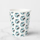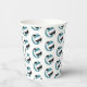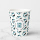 These volleyball themed birthday party paper cups feature multiple small teal, black & white volleyballs arranged in a simple drop pattern - text on a white circle graphic can be customised, currently the number 12 to represent a child's age encircled by the words, "Happy birthday" - by katz_d_zynes