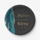 Teal Blue Agate Marble Gold Dark 50th Birthday Paper Plate