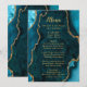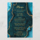 Display your meal selections in style with this elegant wedding menu featuring a teal blue agate marble design accented with gold details. The geode-inspired background creates a sophisticated look, perfect for fall and winter weddings, formal celebrations, or evening events. Designed to coordinate with your wedding stationery suite, this menu is ideal for presenting courses clearly while adding a luxurious touch to your table setting. The clean typography ensures readability while complementing the agate texture. Easily personalize all text to suit your menu and event details, making it a beautiful choice not only for weddings but also for engagement parties, anniversaries, and other formal occasions.