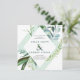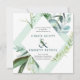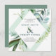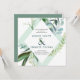 Dramatic teal blue and green botanical foliage create a geometric frame for your wedding details. A soft mint green wash further defines the frame. A decorative ampersand brings the design into the text. The wedding couple names are bold green text. The back of the wedding invitation is a deep sage green.