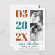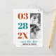 Teal blue and rust two photo Save the Date postcard. It showcases the date in teal and rust typography in a column and two photos of the couple. The phrase "Save the Date" is in script style typography.