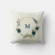 Beautiful romantic throw pillow featuring teal blue and beige flowers and some leaves .
