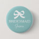 Personalised teal blue and white bridesmaid buttons with little bow tie and elegant font. Great for bachelorette party, bridal shower and beautiful weddings. Classy round design. Posh and cute! Make your own for maid of honour, matron of honour, flower girl, mother of the bride etc.