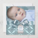 Teal blue damask blue bow beige blue baby boy photo baptism christening invitation. Add your details to the front and back by adding your event details, font style, font size & colour, and wording. Please note - all of the invitation designs you will find on Zazzle are printed graphics on flat paper stock with no actual jewels, bows, raised, embossed, or added parts or pieces.