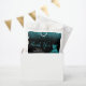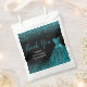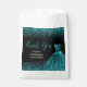 A beautiful teal blue themed elegant watercolor dress gown on a black background with faux glitter at the top and bottom of the favour bag.