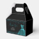 A beautiful teal blue themed elegant watercolor dress gown on a black background with faux glitter at the top and bottom of the favor box.