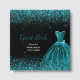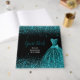 A beautiful teal blue themed elegant watercolor dress gown on a black background with faux glitter at the top and bottom of the guest book.
