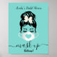 This is a teal blue and white stylish messy bun lady wearing a cute heart mask saying 'Mask up, Buttercup!' to inform your guests to keep everyone safe.
