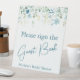Teal blue on white floral bridal shower guest book table sign.