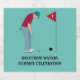 Light teal blue golfer, wearing a cap, red shirt and blue pants, putting a golf ball into a hole design bottle label. Customise the text.