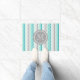 Custom monogrammed doormat with retro chevron zigzags stripes pattern in turquoise aqua teal blue and grey and modern dark grey and white monogram.
