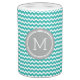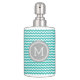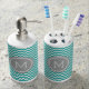 Custom soap dispenser and toothbrush holder in turquoise blue, charcoal grey and white chevron zigzags stripes pattern, adds a personal touch to any bathroom.