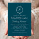This elegant wedding invitation design features a white script monogram initial encircled by a line art botanical wreath on a teal blue background. The names appear in white script, with the rest of the text in classic serif font. The back of the card is solid teal.
