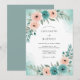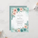 This watercolor design features a romantic palette of teal blue and blush pink. Soft peonies and delicate roses are intertwined with sage green eucalyptus foliage, creating a serene and airy atmosphere. Lush botanical arrangements adorn the corners against a subtle wash of pigment for a dreamlike quality.