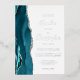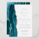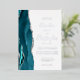 The left-hand edge of this elegant modern wedding invitation features a teal blue watercolor agate border trimmed with faux silver glitter. The customizable text combines handwriting, copperplate and italic fonts in real silver foil on a white background. The reverse side features a matching teal and silver agate design.