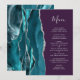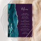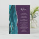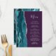 The left-hand edge of this elegant modern wedding menu features a teal blue watercolor agate border trimmed with faux silver glitter. The customisable text combines silver grey handwriting script and copperplate fonts on a purple background. The reverse side features a matching teal and silver agate design.