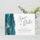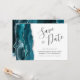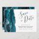 This elegant modern save the date card features a teal blue watercolor agate border trimmed with faux silver glitter. The customisable text combines charcoal grey handwriting script, copperplate and italic fonts on a white background. The reverse side features a matching teal and silver agate design.